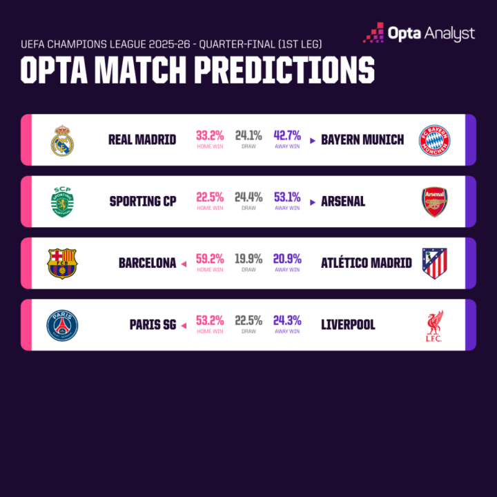OPTA 欧冠1/4决赛首回合预测